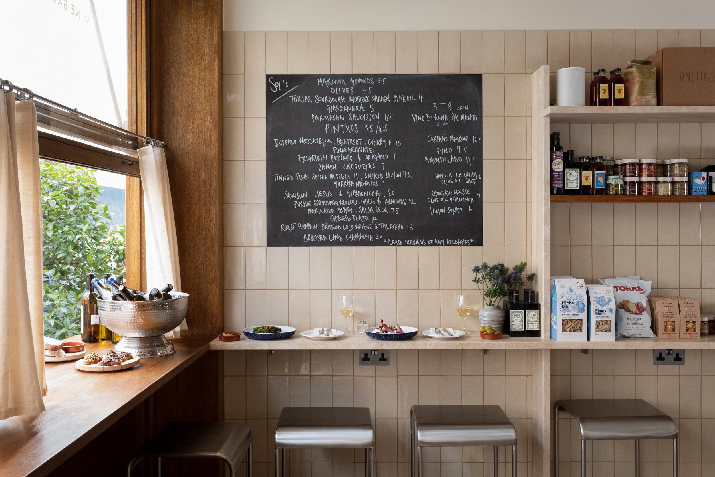 Sol’s is an all-day neighbourhood deli, bottle shop and wine bar. It offers a delectable range of sandwiches, salads, fresh groceries and pantry goods by day, and low-intervention European wines served alongside seasonal small plates by night. All wines curated monthly by Mina Holland in partnership with some of London's best suppliers such as Dynamic Vines and Uncharted Wines. Design, procurement, construction, product design, and operations all by Wendover.