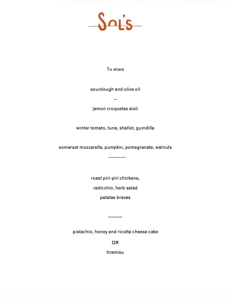 Sol’s is available for private hire or walk-ins — no individual table reservations are taken at this time.